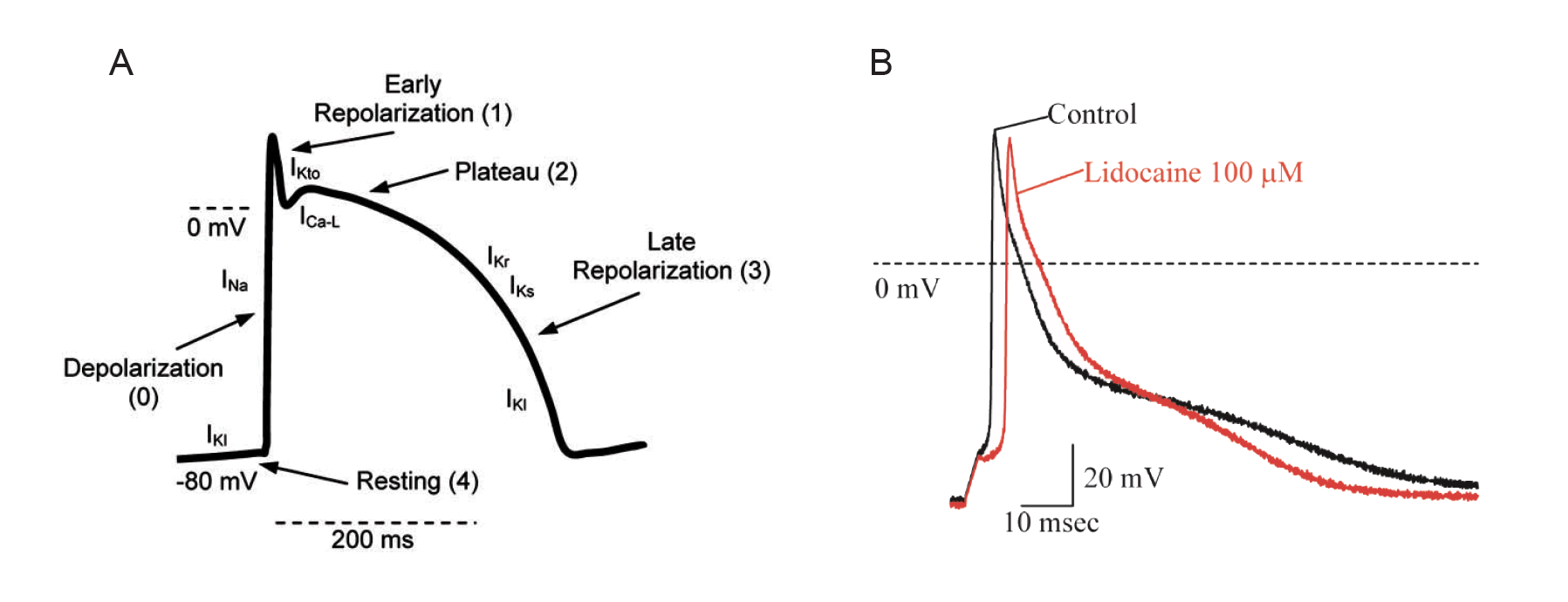 B. 利多卡因对大鼠心室肌动作电位的作用代表图;