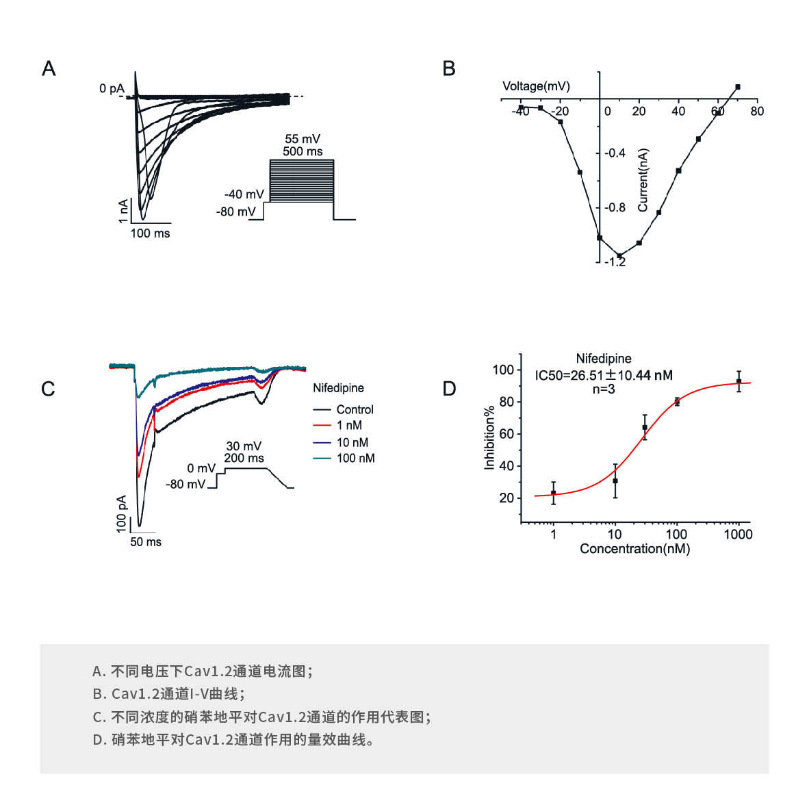 Cav1.2通道为心肌中L型离子通道的主要亚型Cav1.2蛋白及mRNA表达异常与心律失常的发生发展密切相关,并且Cav1.2相关的治疗心律失常的药物在心律失常中治疗效果显著,因此Cav1.2有望作为治疗心律失常的新靶点。同时,Cav1.2也是心脏安全性评价的重要靶点,近期研究表明,如果药物阻断hERG同时阻断Cav1.2通道,则致心律失常的风险要比只抑制hERG的风险要低。