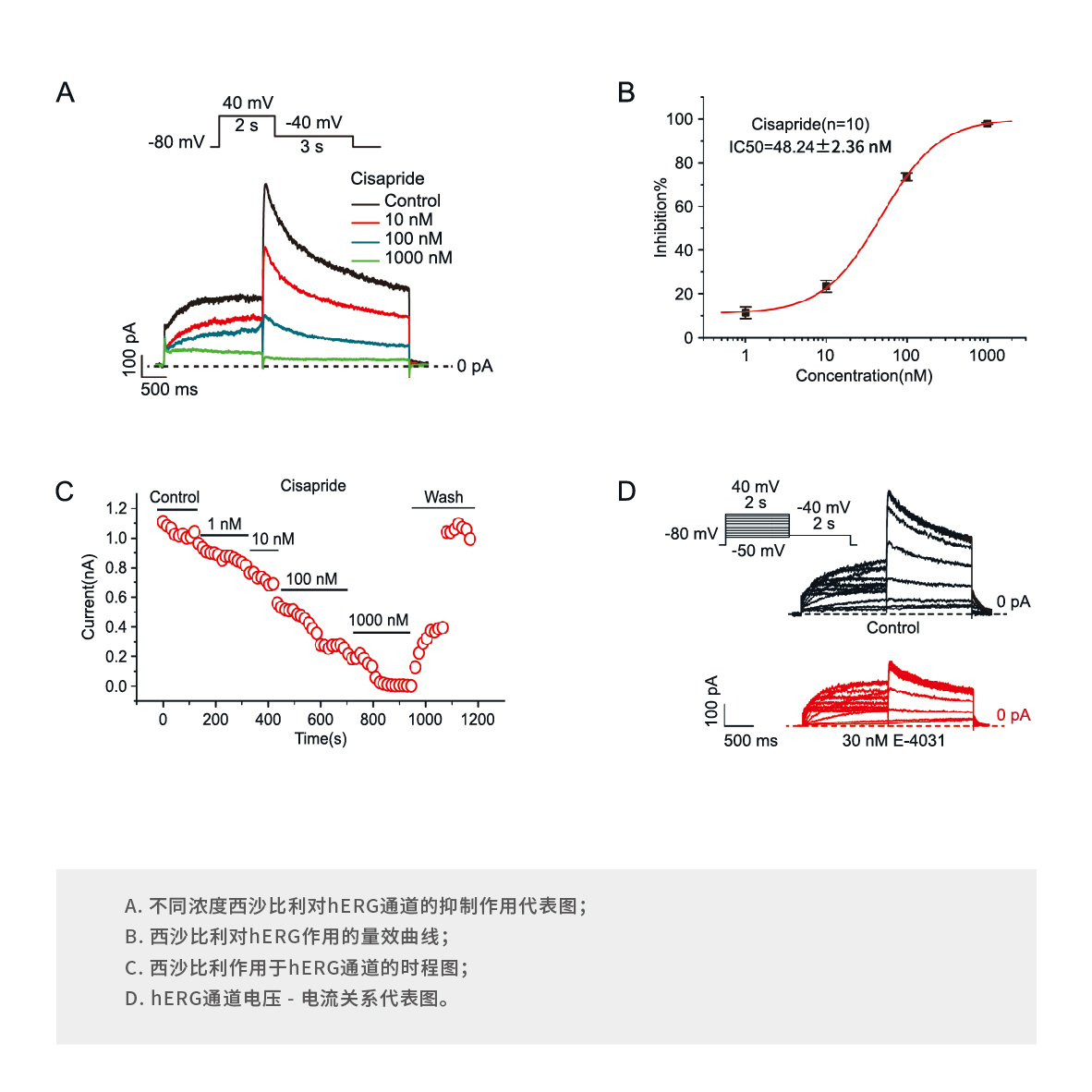随着一些非心血管类药物相继被发现会诱发获得性QT间期延长综合症(LQTS),导致严重的心律失常而退市后,药物的心脏安全性受到广泛关注。human Ether-a-go-go Related Gene(hERG)编码的通道介导一种延迟整流钾电流(IKr),其在心脏动作电位复极化过程中发挥着重要作用。hERG基因突变或药物抑制hERG通道导致QT间期延长,容易诱发心律失常,严重时导致尖端扭转型室性心动过速(TdP)发生猝死。因此,评价药物对hERG电流、心肌动作电位及心脏电信号的影响极为关键。