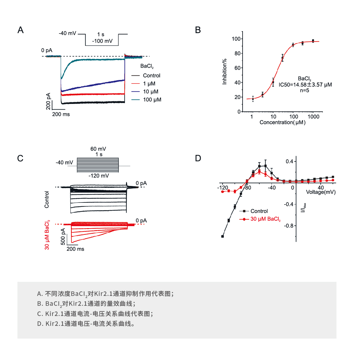 Kir2.1内向整流型钾通道是心脏IK1电流的主要组成部分,IK1是调节心肌细胞静息过程 (4期)的主要影响因素。此外,Kir2.1是组成心肌细胞动作电位复极末期(3期)的主要电流通道之一。Ik1电流升高及其基因表达上调可能与心房颤动离子重构相关,编码Kir2.1的KCNJ2基因突变引起离子通道的生物学特性改变,可能诱发心室心动过速引起的心室节律不齐和心脏骤停,除此之外也易导致短QT综合征和Andersen综合征。因此,Kir2.1钾通道为药物临床前心脏安全性评估中必需检测的内容之一。