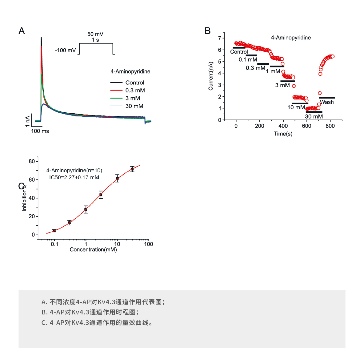 Kv4.3钾通道是Ito核心α功能单位,Kv4.3通道蛋白表达减少,导致Ito通道的下调,引发多种心脏疾病,如心肌肥厚、心衰、心梗、心脏瓣膜病、心房颤动、糖尿病性心脏病等。因此,Kv4.3钾通道是药物临床前心脏安全性评估中必需检测的通道之一。